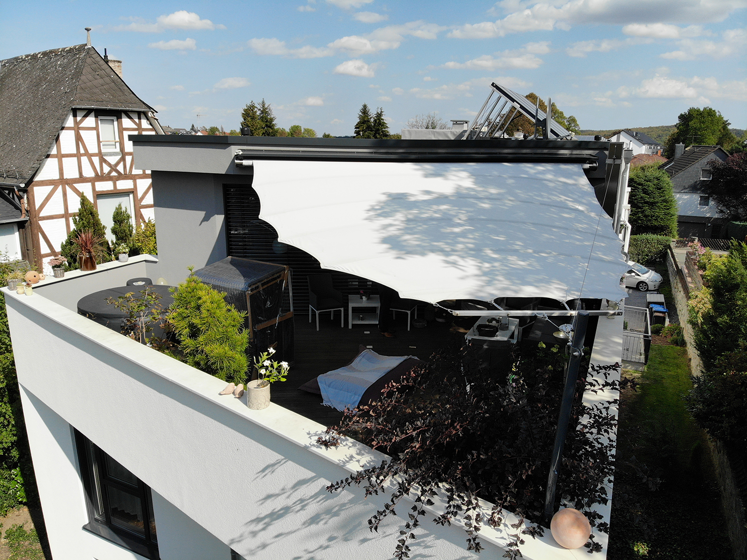 Mit einem festen Terrassendach entsteht ein ganzjährig nutzbarer Wohnraum im Freien, der durch Stabilität und Komfort überzeugt – inklusive Optionen wie Heizelementen, Screens oder Beleuchtung. Dagegen kannst Du ein Sonnensegel flexibel ein- oder ausrollen – ideal für eine besonders dezente Lösung. Gerne beraten wir Dich persönlich zu Deinem Outdoor-Bereich.